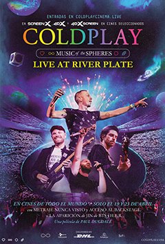 Tras el éxito sin precedentes de la retransmisión en directo de COLPLAY Music Of The LIVE desde Argentina a los cines de todo el mundo el pasado mes de octubre, la banda vuelve a la gran pantalla en este nuevo e impresionante montaje del directo, también disponible en formatos ScreenX, 4DX y 4DX Screen. Grabado durante las diez noches en las que Coldplay agotó todas las entradas en el estadio River Plate de Buenos Aires, este espectacular concierto cuenta con sonido remasterizado e impresionantes efectos visuales del director Paul Dugdale, ganador de un BAFTA y nominado a un Grammy, incluyendo una gran cantidad de metraje inédito. Luces, láseres, fuegos artificiales y pulseras LED llenan la pantalla en un concierto que The Times ha calificado como "el mayor espectáculo de música en directo de la historia". Junto a éxitos clásicos como Yellow, Fix You, Viva La Vida, My Universe y A Sky Full Of Stars, la película cuenta con apariciones estelares de invitados, como Jin de BTS con el debut en directo de su single The Astronaut, que ha batido todos los récords. No pierdas la oportunidad de compartir esta experiencia mágica con los fans de Coldplay de todo el mundo. Este corte también incluye parte de documental, con especiales escenas entre bastidores y entrevistas inéditas con la banda, exclusivo para cines.